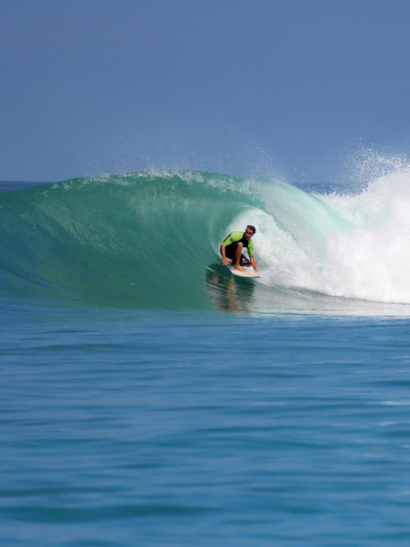 いえるでしょう。波はどんな潮の時でもブレイクし、風は乾季にはオフショアになるため更にベストなコンディションとなります。一日に何時間でもお好きなだけ、しかも友達同士だけのプライベートな空間で夢のようなひと時をお過ごしいただけます。Tランドリゾートの施設及びボートは、珊瑚礁セクションのすぐ前に位置しているため、ご宿泊のバンガローから波乗り地点まではわずかで、最高のアクセスを皆様に提供できます。